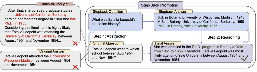 Step-back prompting follows the opposite direction of decomposition by making the query more abstract instead of more detailed. The idea is to reformulate the original question into a broader, higher-level question that captures the underlying concept behind it.